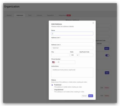Scroll down to the Pickup Addresses section and click the Add button. Name your address, fill in the address information, and add any pickup instructions the lab will need to pickup Orders. A valid Zip Code is required.
