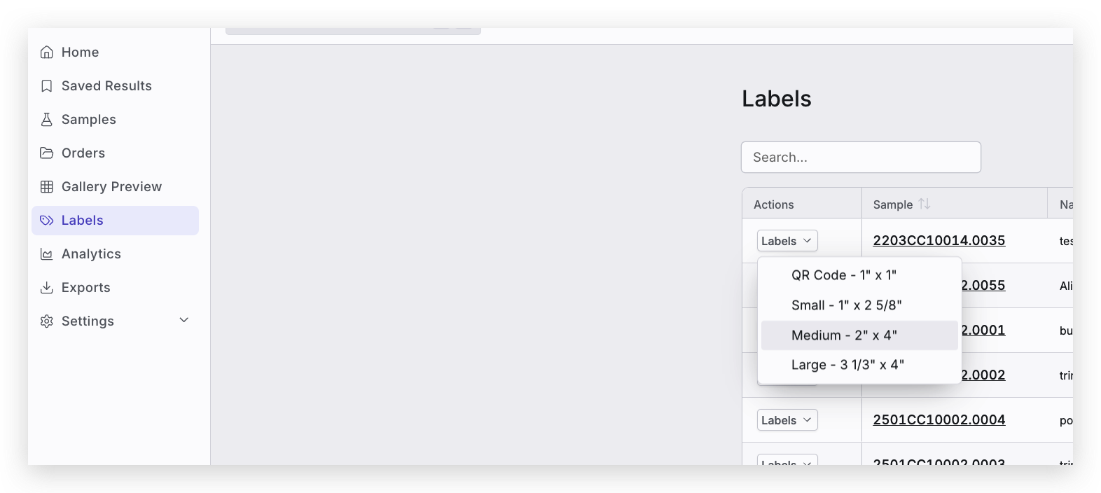 Labels can also be printed in the Sample page by selecting the Labels drop down and the label template you would like to use.