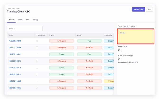 On the right-hand panel, there is a section for Notes where notes for that Client can be added