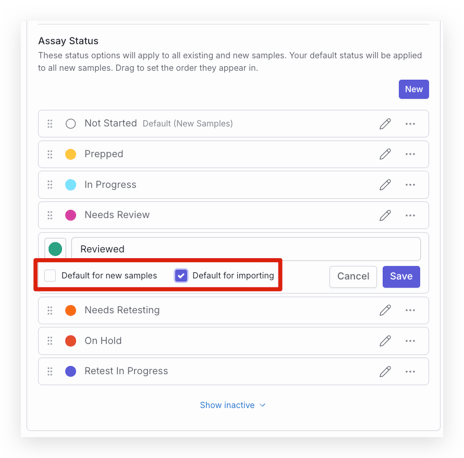 Pro Tip: Defaults can be set for new samples and when results are imported by selecting the pencil icon or the three dots next to a status. See the article How do I Bulk Import Data? for more information on auto-assigning statuses when importing data.
