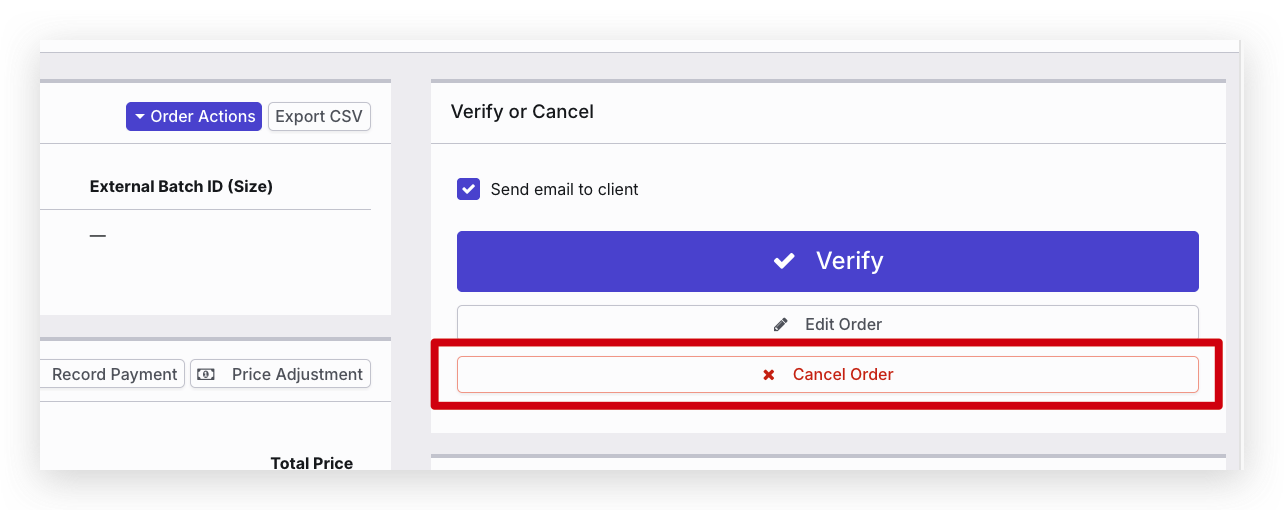 You will be asked for a reason for canceling the Order. Confirm the cancellation by clicking Reject Order