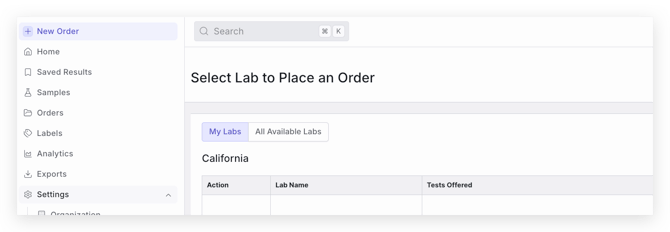 - Once finding the lab you would like to place an Order with, select Place Order in the Actions column