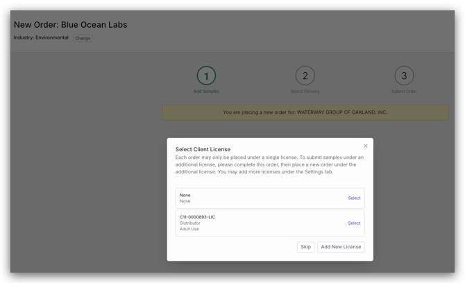 - If applicable, select or add the License that should be associated with the order being placed