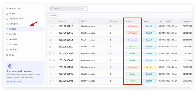- You can view all order statuses (Placed, In Progress, Completed) by navigating to the Orders table in the left hand panel