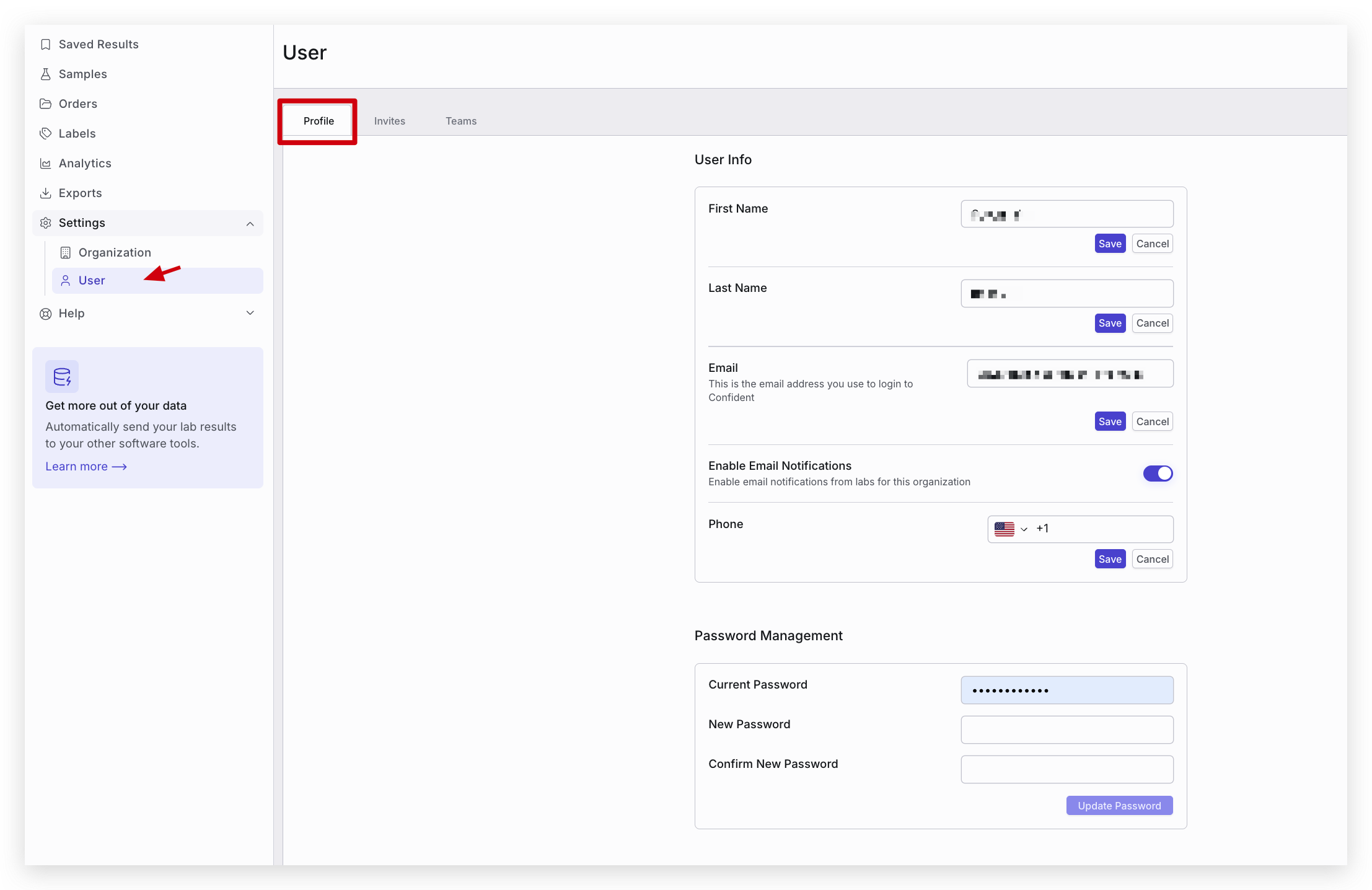 If you are not receiving email or text notifications from the Laboratory, check your settings in Settings -> User -> Profile to make sure that your information is correct and you have notifications enabled.
