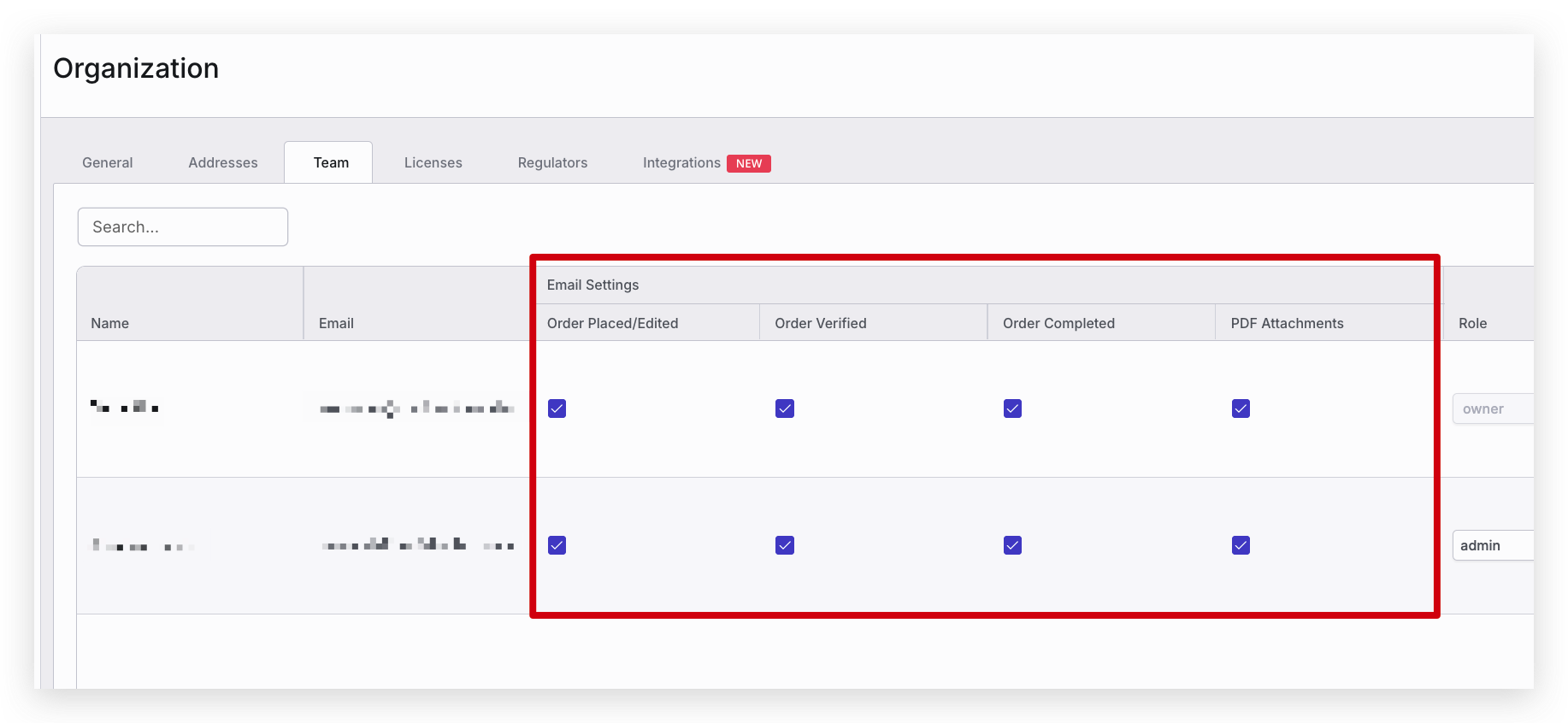 You can also contact your Organization’s account Administrator or Owner to check your email notification settings or update your email notifications. Team email notification settings can be updated for steps throughout the Order process by going to Settings -> Organization -> Team.
